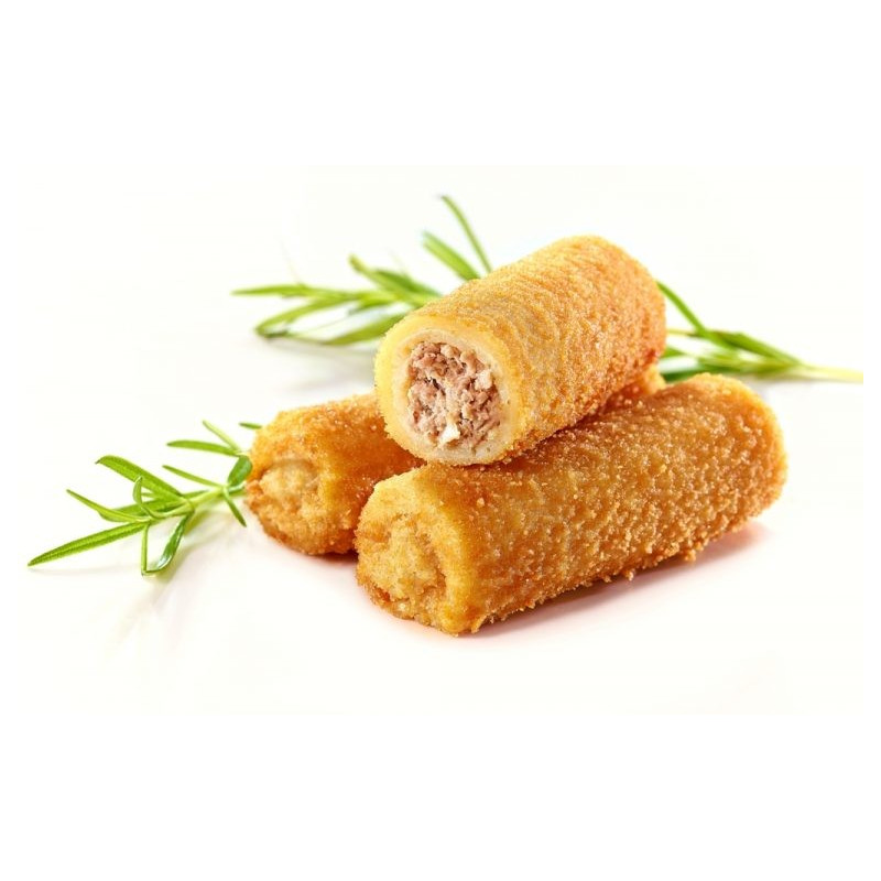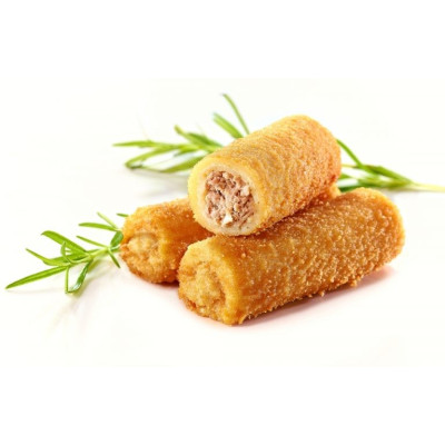 Doskonale doprawiony mięsny farsz, przygotowany z najwyższej jakości polskiego mięsa, otoczony chrupiącym ciastem naleśnikowym. Krokiety z mięsem to doskonała propozycja na szybki domowy obiad. Nasze krokiety przygotowujemy według starannie przez lata wypracowanej receptury. Idealnie smakują podane z czerwonym barszczem.